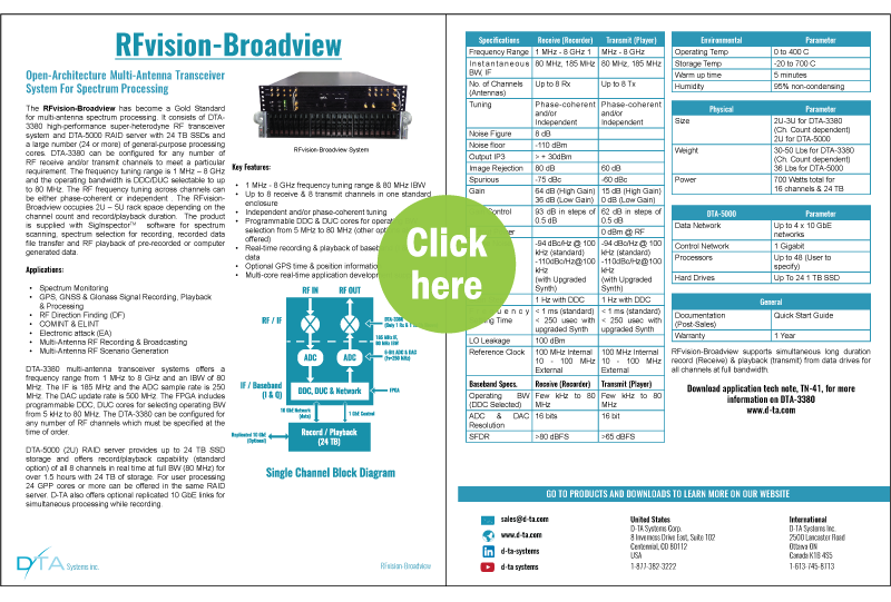 super-heterodyne RF transceiver with 1 MHz – 8 GHz frequency tuning range, 80 MHz IBW, 16 bit data converters, programmable DDCs/DUCs for operating BW selection from a few kHz to 80 MHz, phase-coherent and/or independent tuning and DTA-5000 RAID server with a minimum of 24 TB SSDs for real-time record, playback and multi-core software processing of all N RF channels at full 80 MHz BW. N is user specified number of receive and/or transmit channels. The Broadview can be configured for any N: 4, 8, 16 or more. The Broadview is designed for challenging applications: